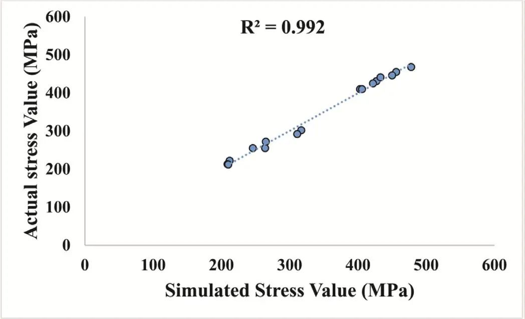 自適應(yīng)神經(jīng)模糊推理系統(tǒng)(ANFIS)是一種具備自適應(yīng)學(xué)習(xí)能力和基于邏輯規(guī)則推理的高性能計(jì)算模型。通過構(gòu)建該模型并不斷優(yōu)化,輸入預(yù)定轉(zhuǎn)速、焊接速度、預(yù)熱和焊縫中心距離,模擬焊接參數(shù)對殘余應(yīng)力的影響規(guī)律。在合理范圍內(nèi)隨機(jī)選取16組模擬數(shù)據(jù)結(jié)果,與實(shí)驗(yàn)數(shù)據(jù)進(jìn)行比較以評估模型的準(zhǔn)確度,擬合結(jié)果如圖4所示,表明該模型的精確度較高。