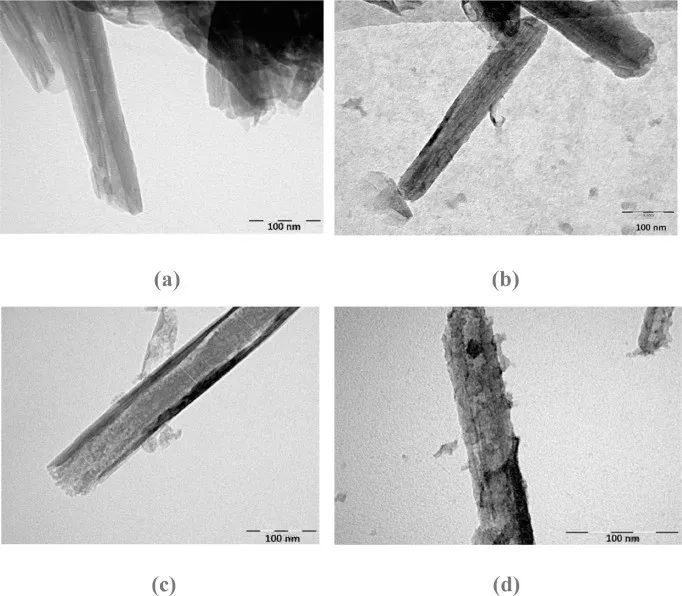 圖1 TEM圖像:(a)HNTs,(b)抑制劑負載的HNTs,(c)EHNTs和(d)抑制劑負載的EHNTs