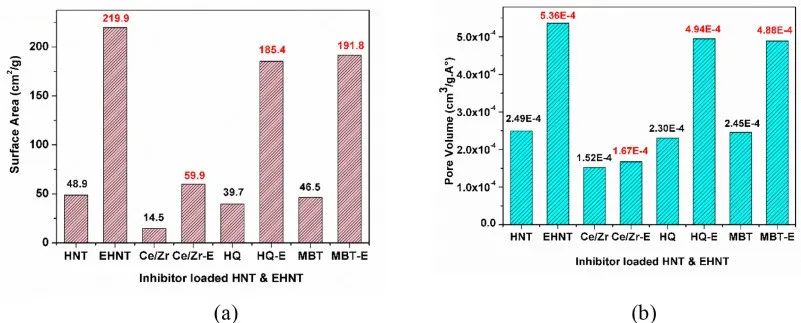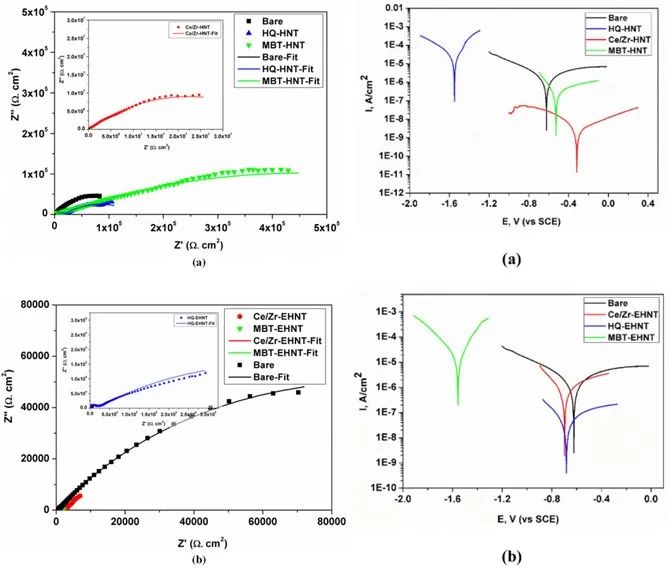 近日,來自印度粉末冶金與新材料國際研究中心的R. Subasri博士等人利用埃洛石納米管(HNTs)和刻蝕后的埃洛石納米管(EHNTs)作為納米容器,分別負載了Ce3+-Zr4+、2-巰基苯并噻唑(MBT)和8-羥基喹啉(HQ)等緩蝕劑,對比研究了HNTs和EHNTs中不同緩蝕劑分子的負載釋放動力學。研究結(jié)果表明,在3.5 wt.% NaCl水溶液中浸泡120小時后,Ce3+-Zr4+-HNTs涂層的電化學阻抗Rct值為4.464×107 Ω·cm2,自腐蝕電流密度最低,為2.667×10-9 A/cm2,表現(xiàn)出最好的腐蝕防護能力;通過對HNTs和EHNTs釋放的緩蝕劑進行定量分析,發(fā)現(xiàn)Korsmeyer-Peppas模型最符合緩蝕劑的釋放動力學過程。
