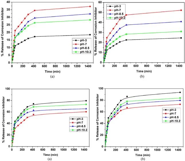 本文還探索了HNTs和EHNTs中不同緩蝕劑的釋放速率。負載在HNTs和EHNTs中的Ce3+-Zr4+及HQ在不同pH值NaCl水溶液中的釋放速率曲線如圖4所示,初期緩蝕劑的釋放百分比隨時間而增加,隨后達到穩(wěn)定狀態(tài)。無論HNTs和EHNTs負載了HQ或是Ce3+-Zr4+,EHNTs在任一pH值下的釋放百分比均更高,這可能與刻蝕后的EHNTs管腔能夠負載更多的緩蝕劑有關。研究還發(fā)現(xiàn)Ce3+-Zr4+的釋放百分比在pH為7時最高,在pH為3時最低,這可能是由于此時Ce3+-Zr4+形成了MAA絡合物,緩蝕劑釋放量減少。
