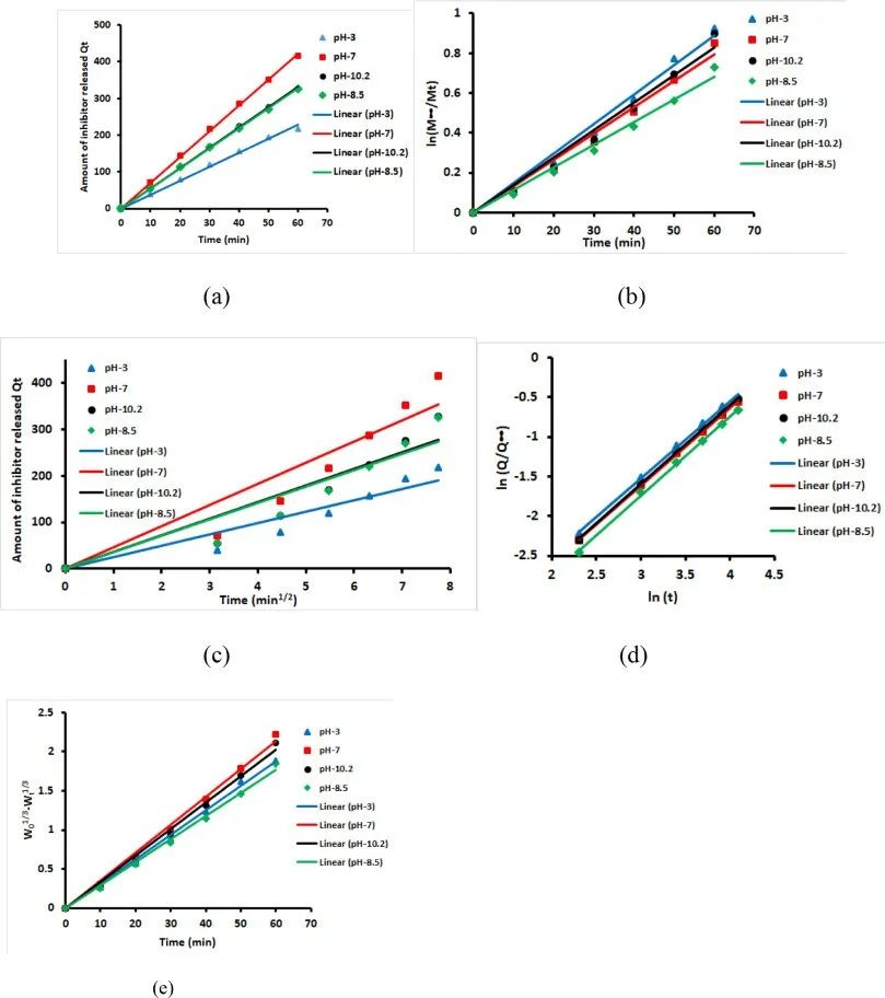 圖5 Ce3+-Zr4+在不同pH值下從HNTs釋放的釋放速率模型:(a)零級,(b)一級,(c)Higuchi模型,(d) Korsmeyer-Peppas模型和(e)Hixson-Crowell模型